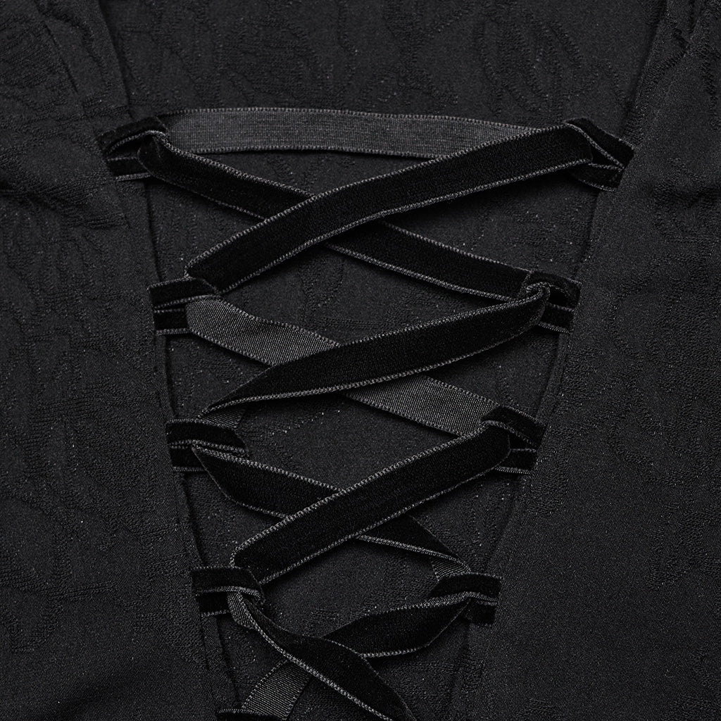 Rock your style with the Punk Rave Cimarron Gothic Keyhole Shirt. This zip front shirt features a keyhole cut out and puffed sleeves. Adorned with beautiful embroidery and a velvet ribbon lace up back, this shirt is sure to make a statement. Embrace your gothic style with this standout piece!