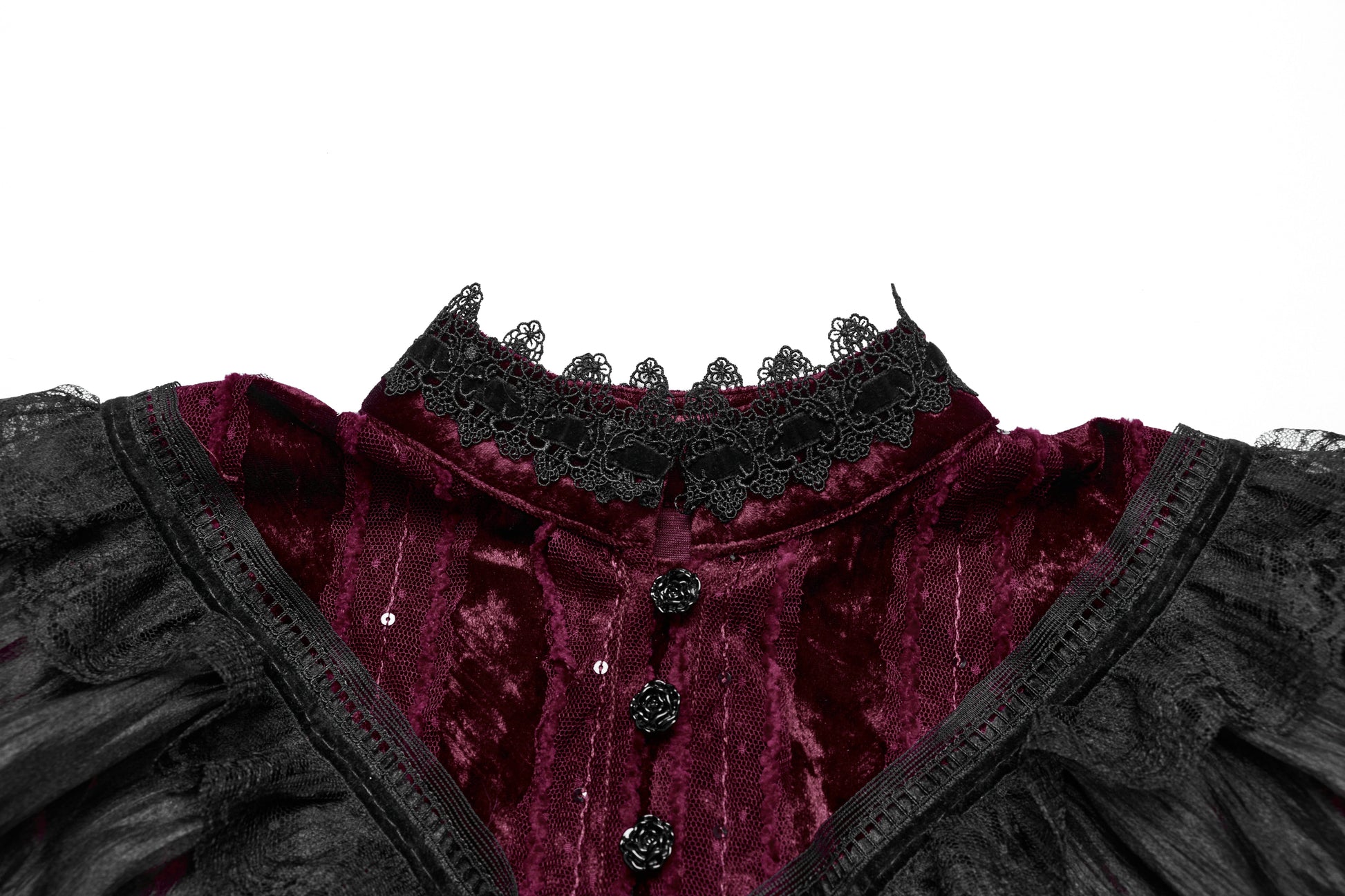 Add a regal finishing touch to your outfit with the Punk Rave Elysia Velvet Ruffle Goth Shawl – Crimson. Crafted from soft, elastic velvet in a rich crimson hue, this dramatic shawl features a layered ruffle trim in contrasting black for a striking gothic aesthetic. The high collar is adorned with delicate lace edging, while the front showcases ornate rose-shaped buckles for a vintage touch. Perfect for layering over dresses, tops, or corsets to elevate your alternative look.