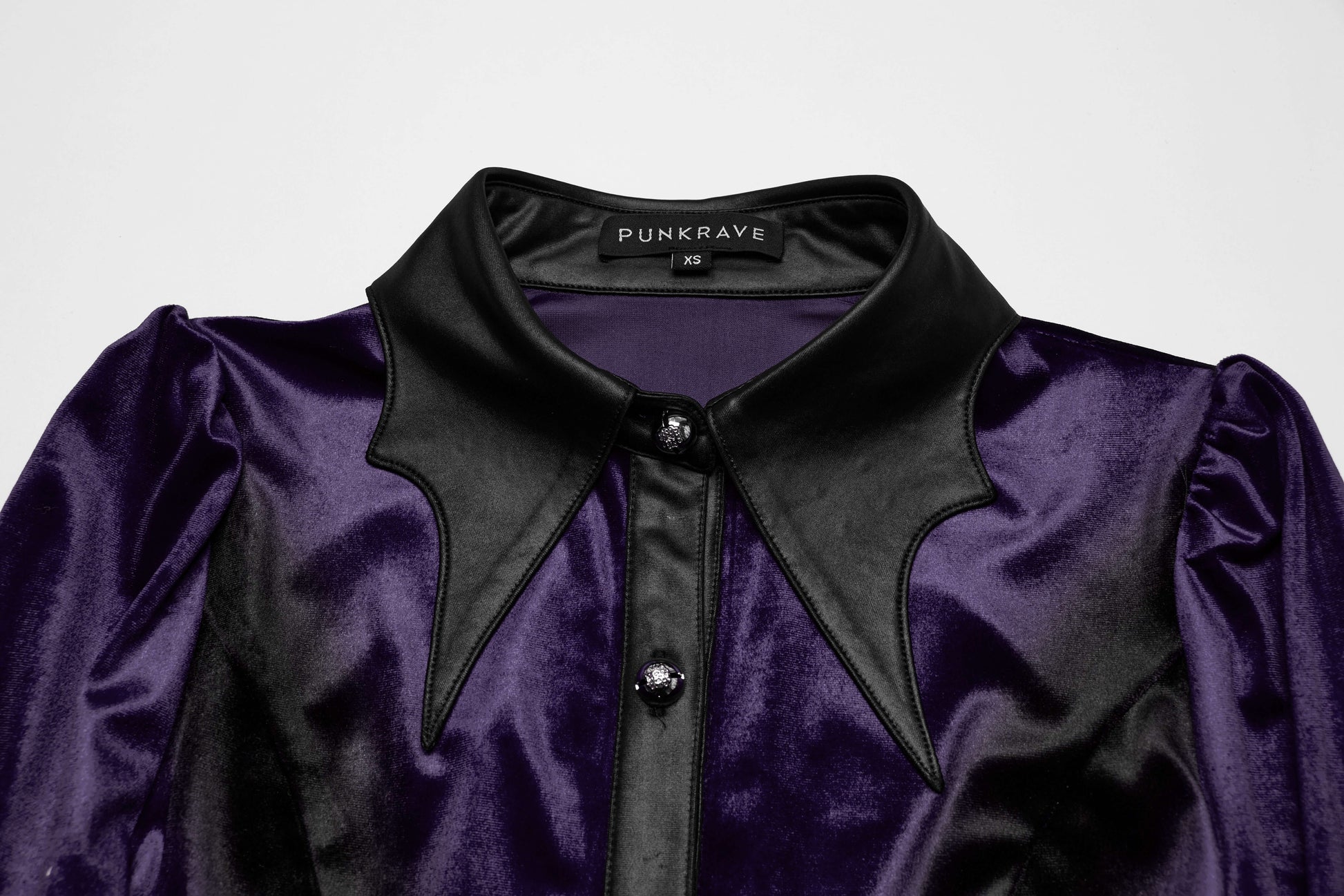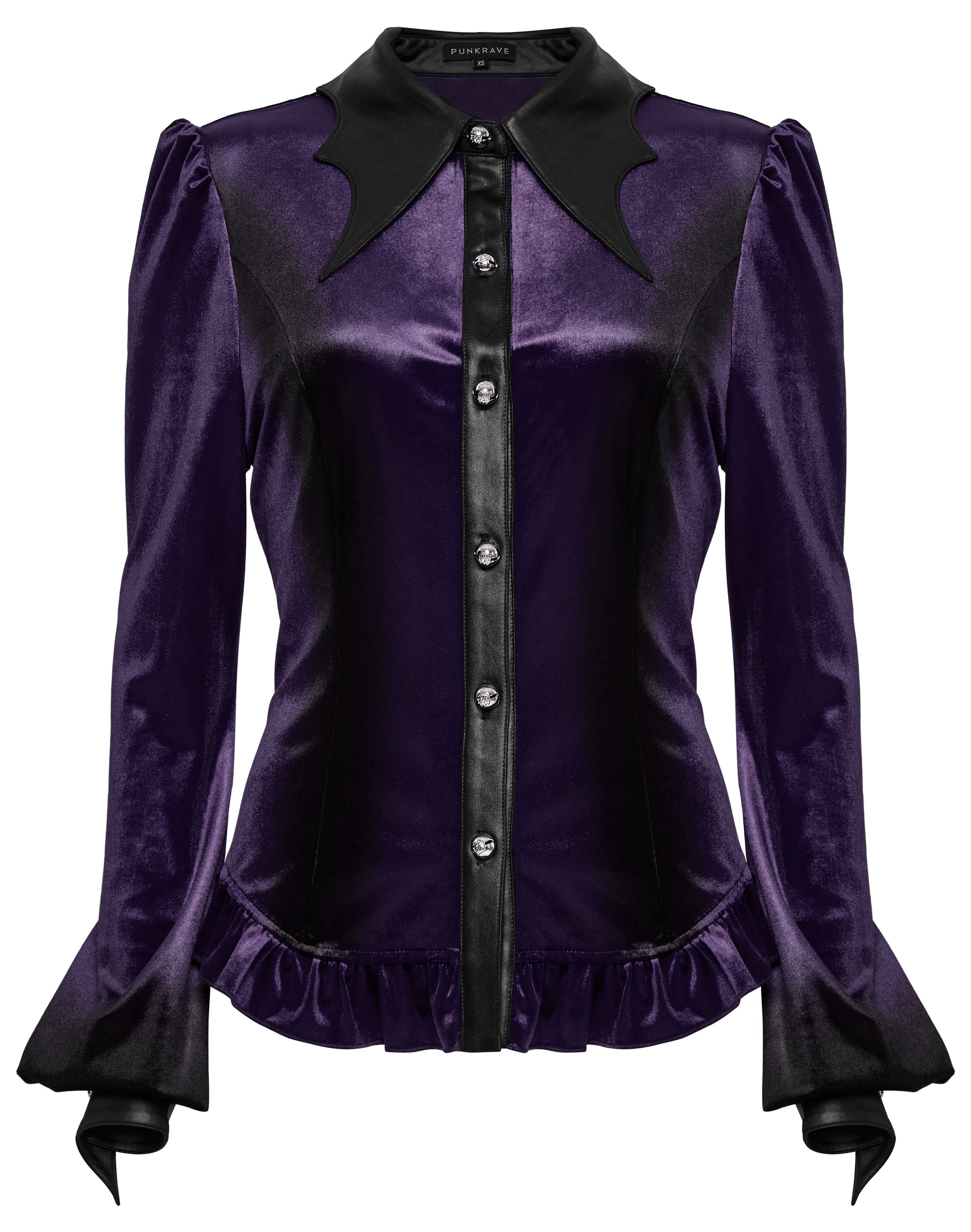 Get ready to stand out in style with the Punk Rave Fawn Gradient Printed Shirt in Violet. Made from soft and stretchy velvet, this shirt features a unique gradient design that accentuates your feminine shape. The bat collar and cuffs add a touch of design, while the exquisite carved floral patterns and ruffled hem add texture and detail. Plus, the adjustable waist ensures a perfect fit. Perfect for adding a bold and playful touch to your wardrobe.