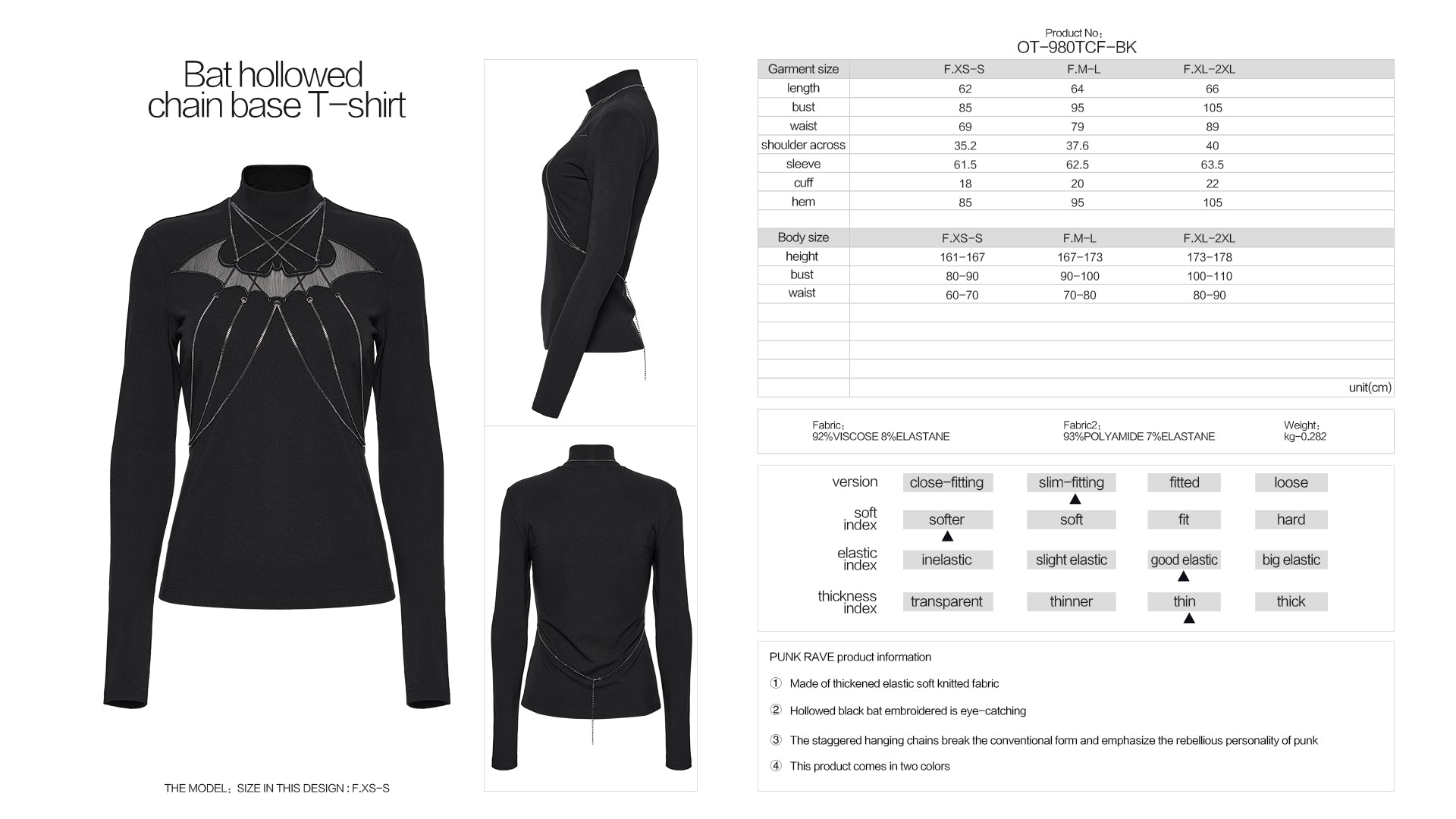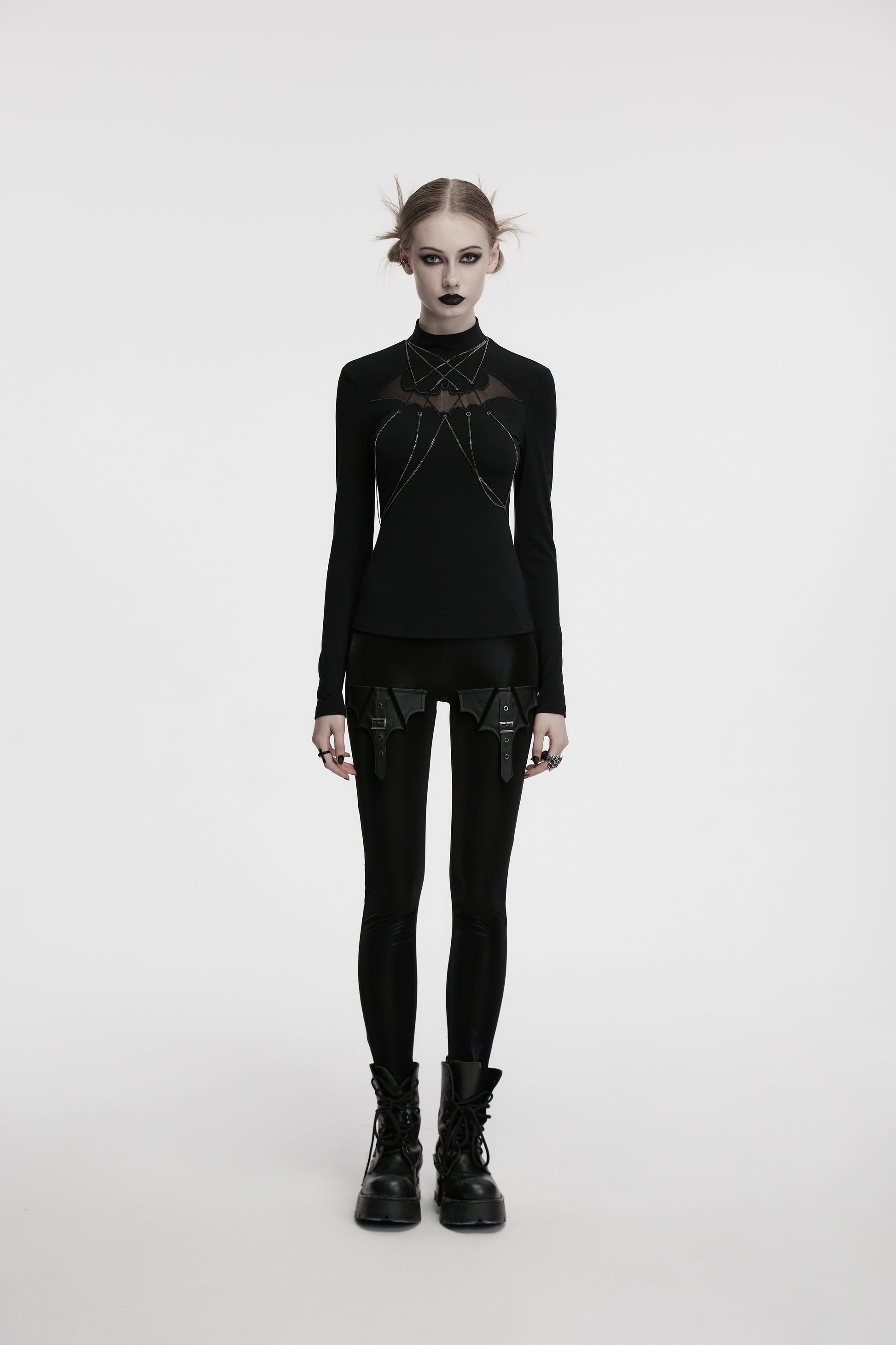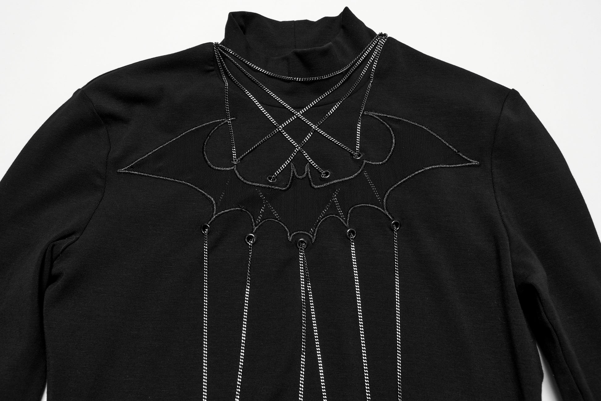 Unleash your dark allure with the Punk Rave Morrigan Bat Chain Goth Top – Black. Crafted from thickened elastic knitted fabric, this striking piece combines comfort with dramatic punk-inspired styling. The front features a bold hollowed bat motif embroidered with precision, layered over sheer mesh for a mysterious, ethereal touch. Staggered silver-tone chains cascade from the bat wings, creating movement and emphasising a rebellious edge. Perfect for pairing with high-waisted skirts, leather trousers, or layered under strappy dresses for an alternative statement look.