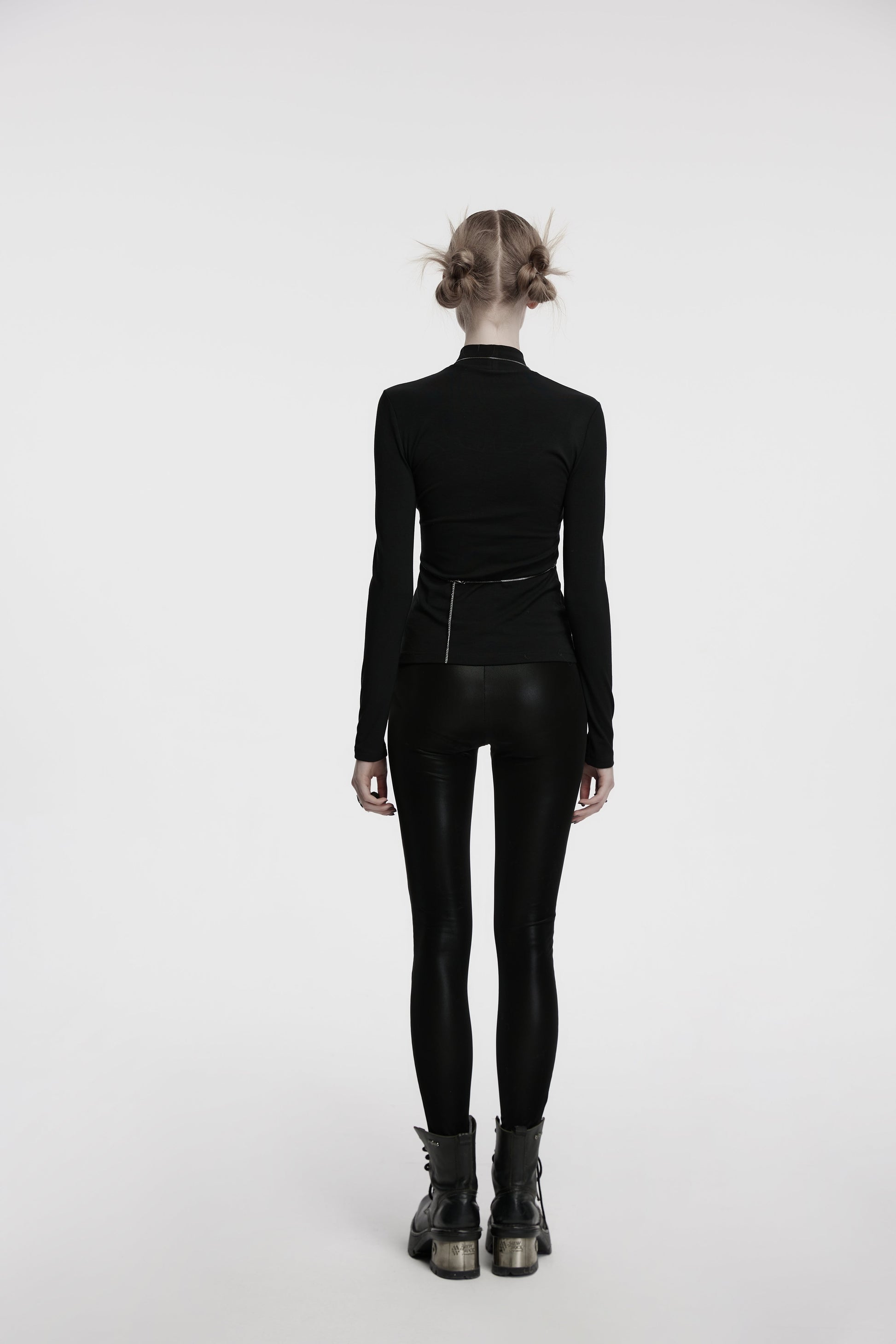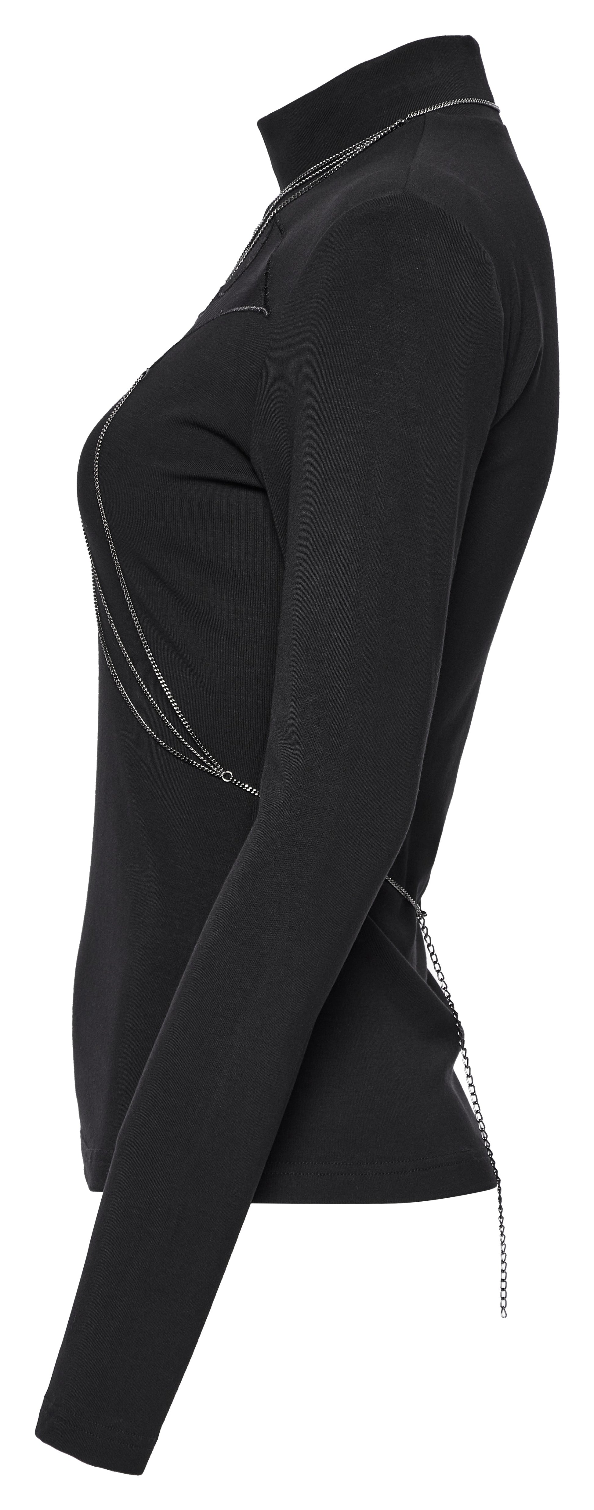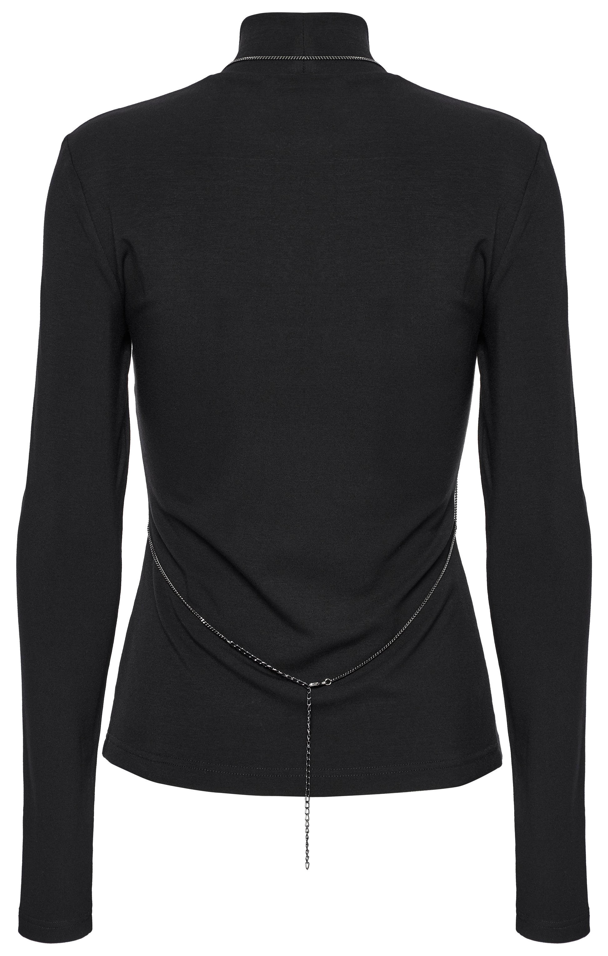 Unleash your dark allure with the Punk Rave Morrigan Bat Chain Goth Top – Black. Crafted from thickened elastic knitted fabric, this striking piece combines comfort with dramatic punk-inspired styling. The front features a bold hollowed bat motif embroidered with precision, layered over sheer mesh for a mysterious, ethereal touch. Staggered silver-tone chains cascade from the bat wings, creating movement and emphasising a rebellious edge. Perfect for pairing with high-waisted skirts, leather trousers, or layered under strappy dresses for an alternative statement look.