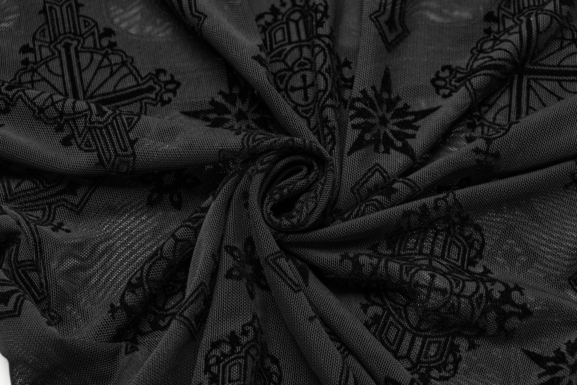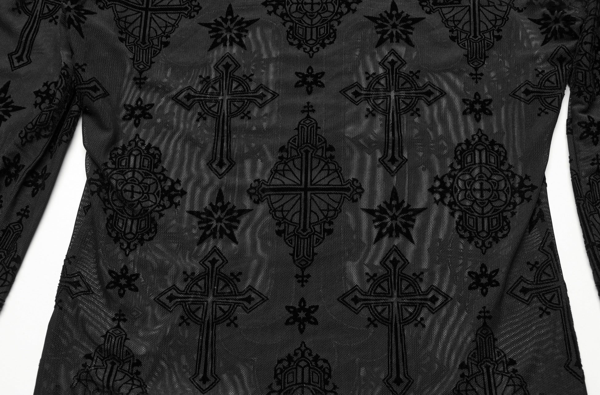 Step into dark sophistication with the Punk Rave Morrigan Cross Embroidered Mesh Top, a striking blend of sheer allure and symbolic design. Crafted from elastic mesh with an all-over flocked cross pattern, this slim-fitting top commands attention with its large central embroidered cross framed by intricate motifs. The high neckline and long sleeves lend a refined touch, while the see-through finish makes it perfect for layering over bralettes, under harnesses, or paired with tailored goth trousers and skirts.