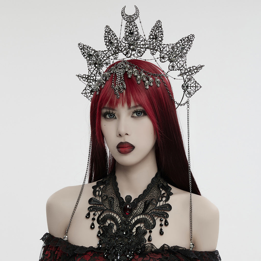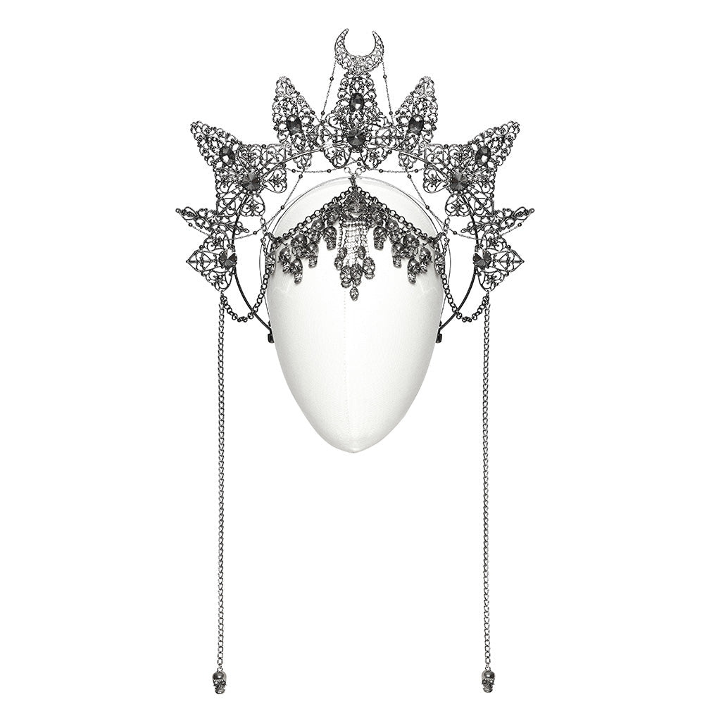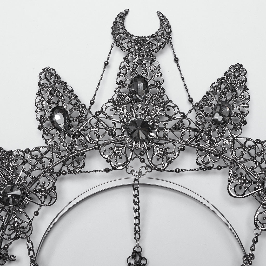Channel your inner gothic royalty with the Punk Rave Nicandra Skull Crown. This exquisite metal crown features a unique halo design and 3D inlaid gemstones for an eye-catching look. With skull pendants and dynamic chains, this crown adds a touch of romantic and beautiful edge to any outfit.