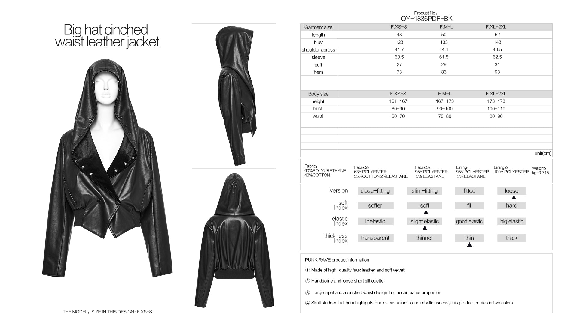 Exude dark, streetwise style with the Punk Rave Nyx Hooded Faux Leather Jacket, a bold outerwear piece that fuses casual edge with gothic flair. Made from high-quality faux leather and soft velvet, this loose-fit jacket features a dramatic oversized hood with skull studs along the brim for a rebellious touch. The large lapels and cinched waist design create a flattering silhouette, while the cropped length keeps it modern and versatile. Perfect for layering over dresses, tops, or corsets for an effortlessly alternative look.