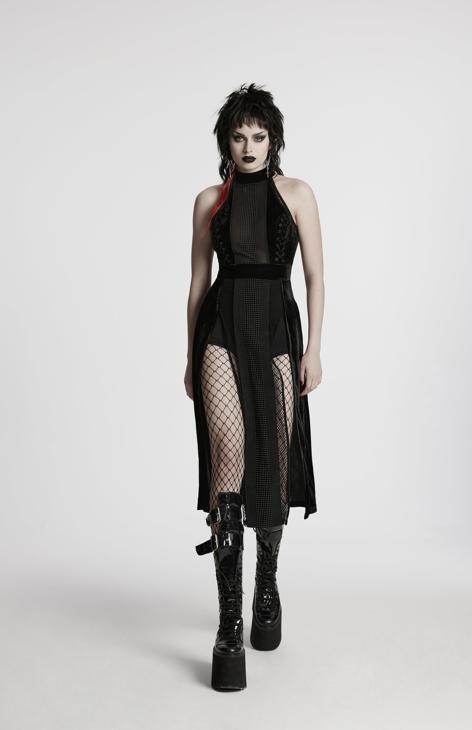 Turn heads at any dark soirée with the Punk Rave Selene Velvet Mesh High Slit Goth Dress – Black. This striking gown is crafted from high-quality elastic velvet and sheer mesh for a luxurious yet daring effect. The halter neck design creates a sleek, minimalist silhouette, while the front showcases intricate bead decorations for an eye-catching focal point. A sheer mesh centre panel and daring thigh-high slit bring a seductive edge, while the corset-style lace-up back ensures a perfect fit. Perfect for gothic glamour, alternative events, and dramatic evening wear.