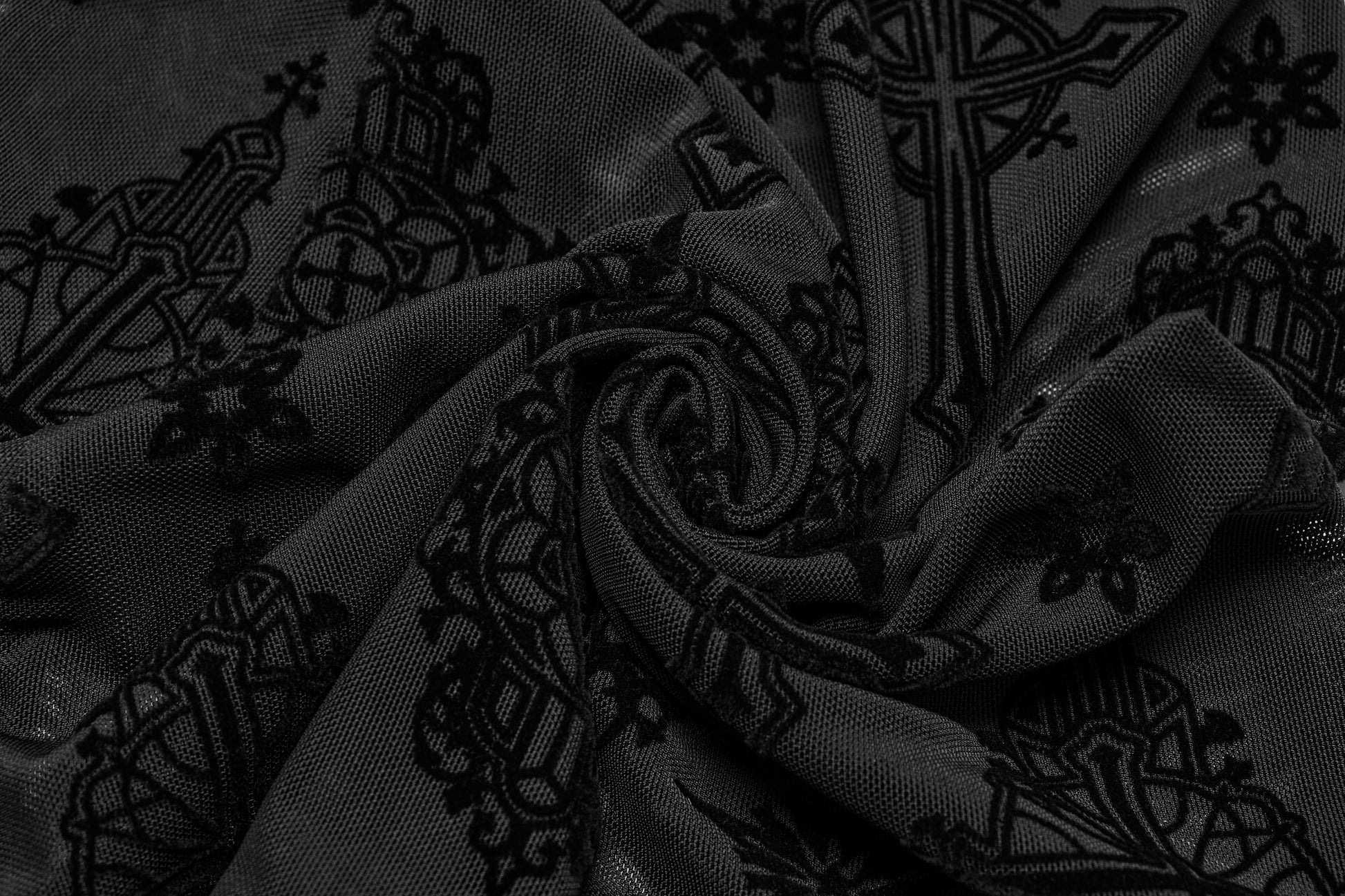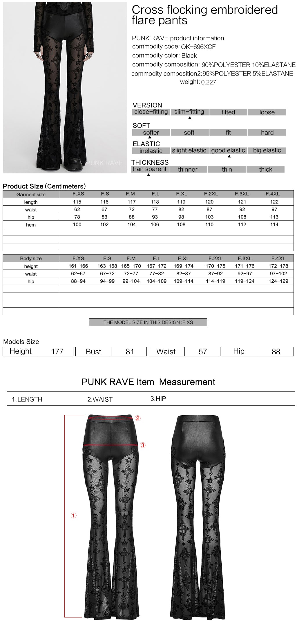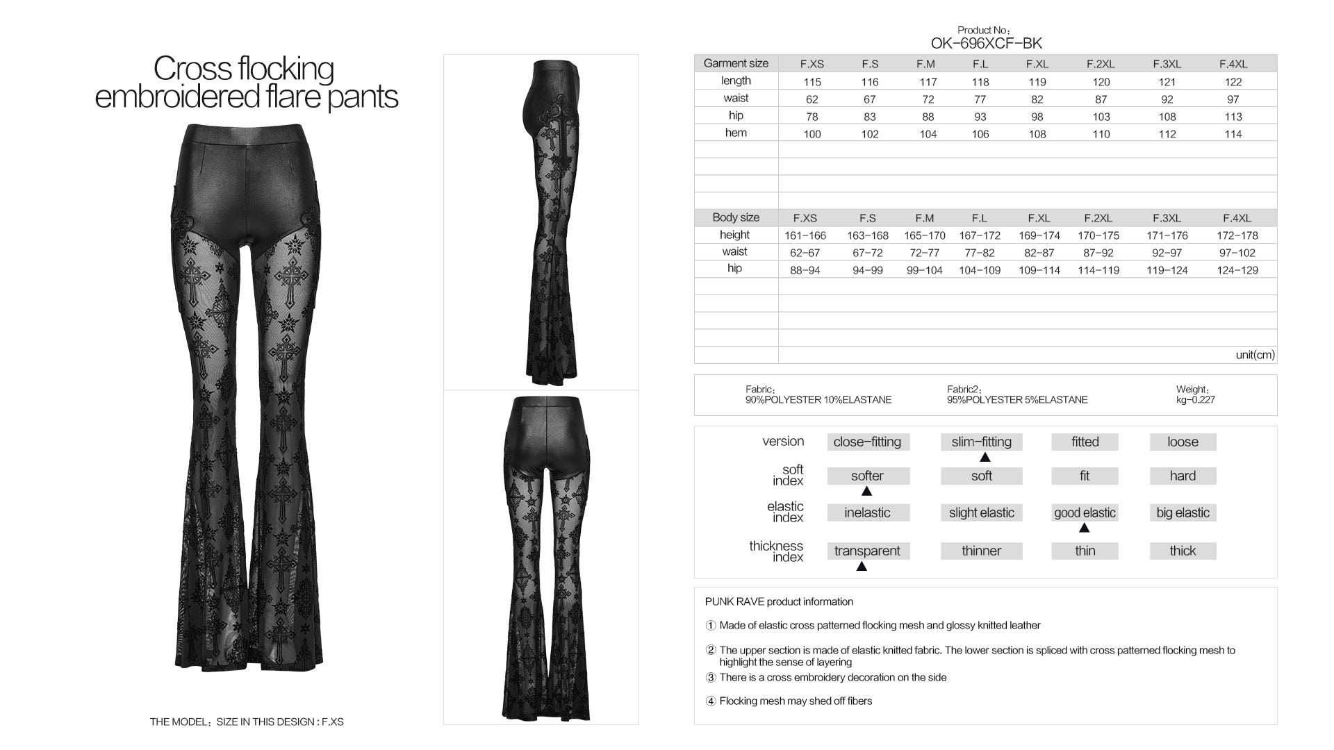 Step into the shadows with the Punk Rave Seraphina Cross Flocking Flare Pants, a striking blend of dark romance and rebellious flair. These close-fitting flares feature an intricate cross-patterned flocking design on a sheer mesh base, creating a dramatic silhouette that’s perfect for any goth or alternative look. The upper section is crafted from glossy knitted leather for a bold contrast, while the sheer lower section lets the embroidered crosses truly stand out.