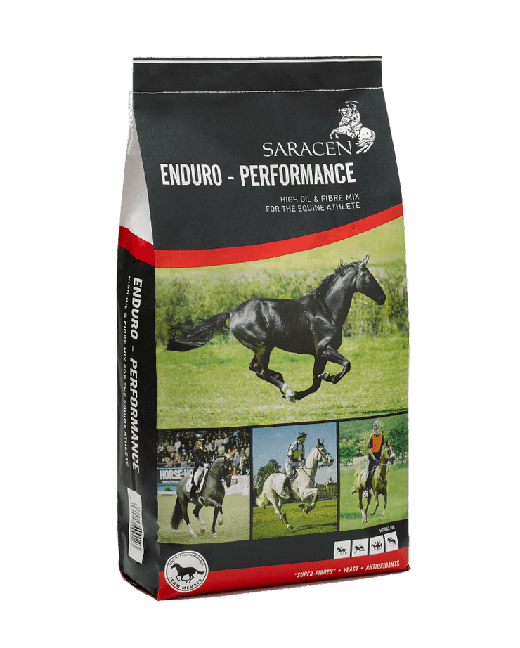 Saracen Enduro-Performance contains quality protein sources and essential amino acids to support cell renewal tissue and muscle repair as well as maintaining topline and muscle tone. It contains antioxidants including vitamin E which are essential to support normal recovery rates post exercise and immune function particularly in those horses that are travelling and competing on a regular basis.