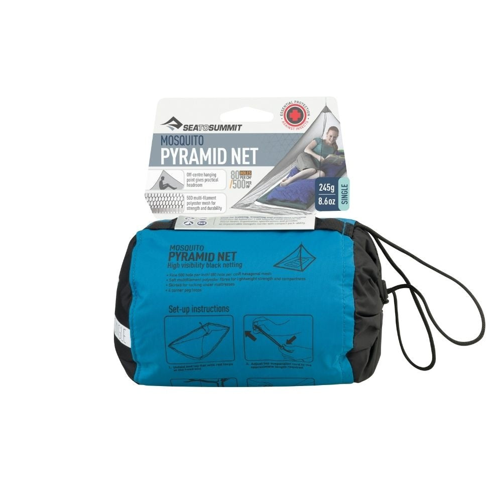 Experience the ultimate protection against mosquitoes and other bugs with our Sea To Summit Mosquito Pyramid Net - Single. Perfect for trekking, traveling, and camping in the wilderness, this unique tent-style design offers maximum coverage with minimal weight and size. The 50D black mesh netting provides high visibility, ensuring a peaceful and bug-free adventure. Don't compromise on safety and comfort, choose Sea To Summit.