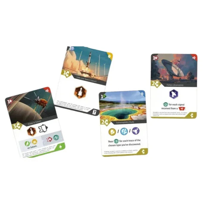 You will also make use of over 200 cards to aid your efforts or focus your research in a particular direction for additional bonuses and rewards. Each card has unique effects and illustrations and depicts real-life technologies, projects, and discoveries (like the ISS, Large Hadron Collider, Perseverance rover, Voyager probe, and many more).