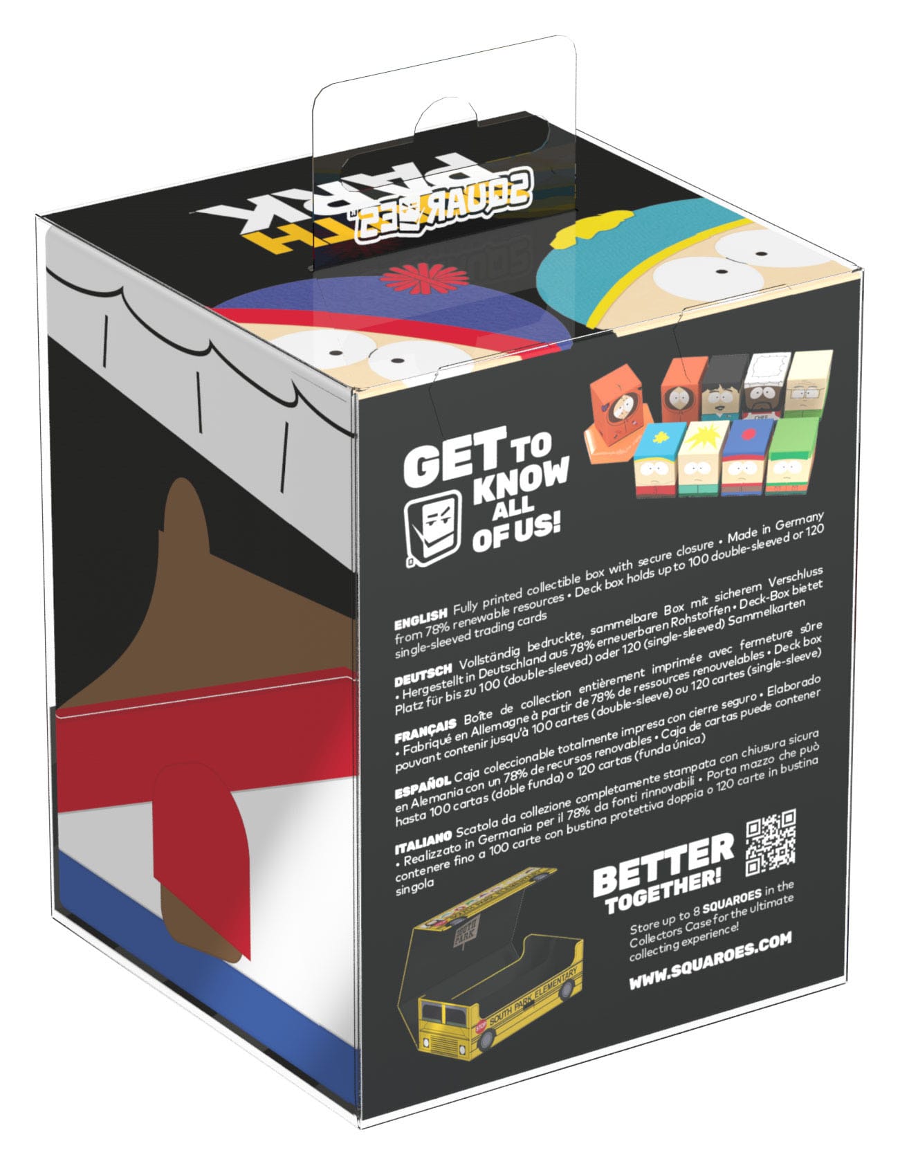 Collectible box for storing TCG decks, tabletop gaming accessories, and/or collectibles. The Chef Squaroe from the South Park™ edition holds up to 100 cards in double protective sleeves if used as a deck box. Squaroes are made from 78% renewable recources and fit perfectly into the separately available Collectors Case.
