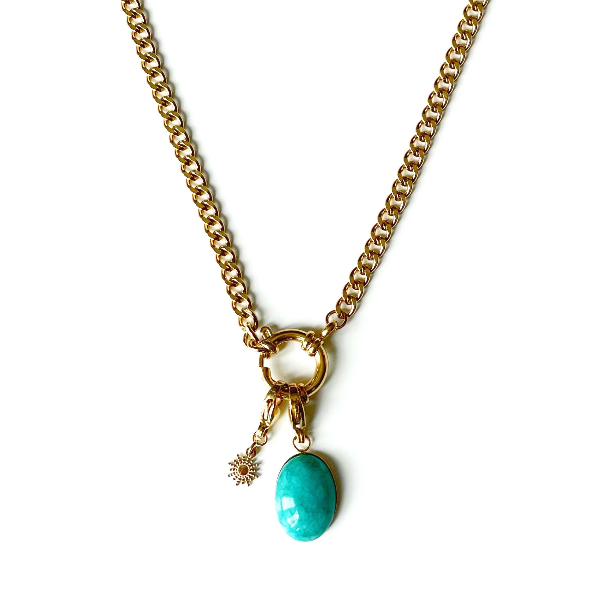 Make a statement with the Stella Necklace, a bold yet elegant piece designed to stand out. Featuring a chunky gold-tone chain paired with a striking oval turquoise pendant, this necklace blends timeless charm with contemporary style. A delicate sun charm adds a celestial touch, making it a unique addition to your jewellery collection.