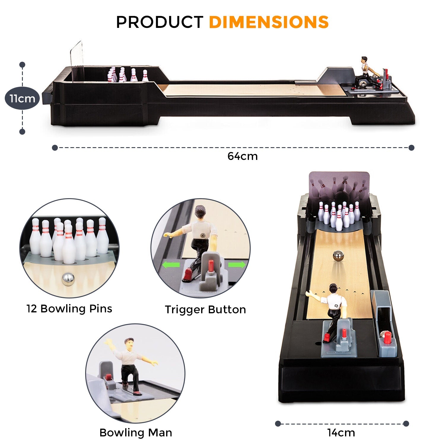 Want to have a good few hours of fun with family members or friends? Our Table Top Bowling Game can be a great addition to your leisure time. The player doesn't throw the ball but uses a spring-loaded launcher with a small figurine of a bowler to send the ball up the 3′ long alley. You'll notice right away this game is small and built to be like a little table toy. It does not replicate the full experience of bowling.