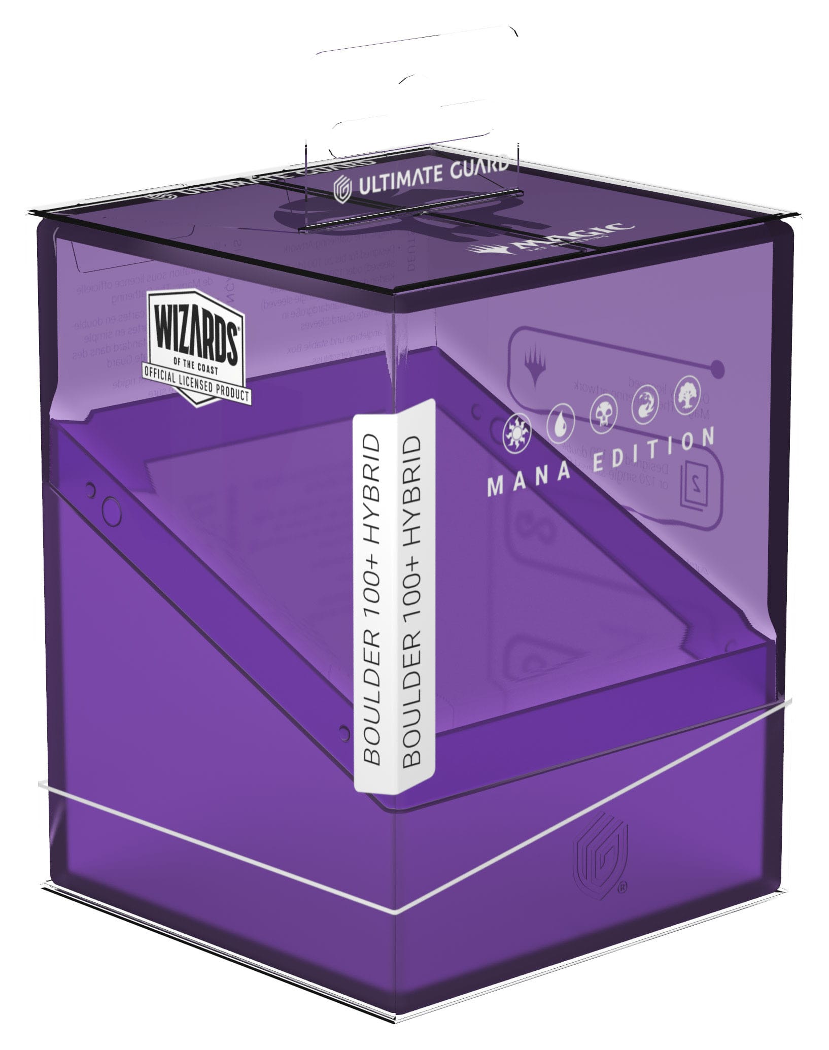 Ultimate Guard's Boulder 100+ Hybrid combines the completely transparent top of the Boulder Clear with a soft-touch base in the style of the original Boulder. The officially licensed MTG deck box is easy to open, but offers reliable protection for your cards thanks to its sturdy case and secure closure. The Boulder 100+ Hybrid holds up to 100 double-sleeved cards and is suitable for all Magic: The Gathering formats such as Commander (EDH), Standard or Modern.