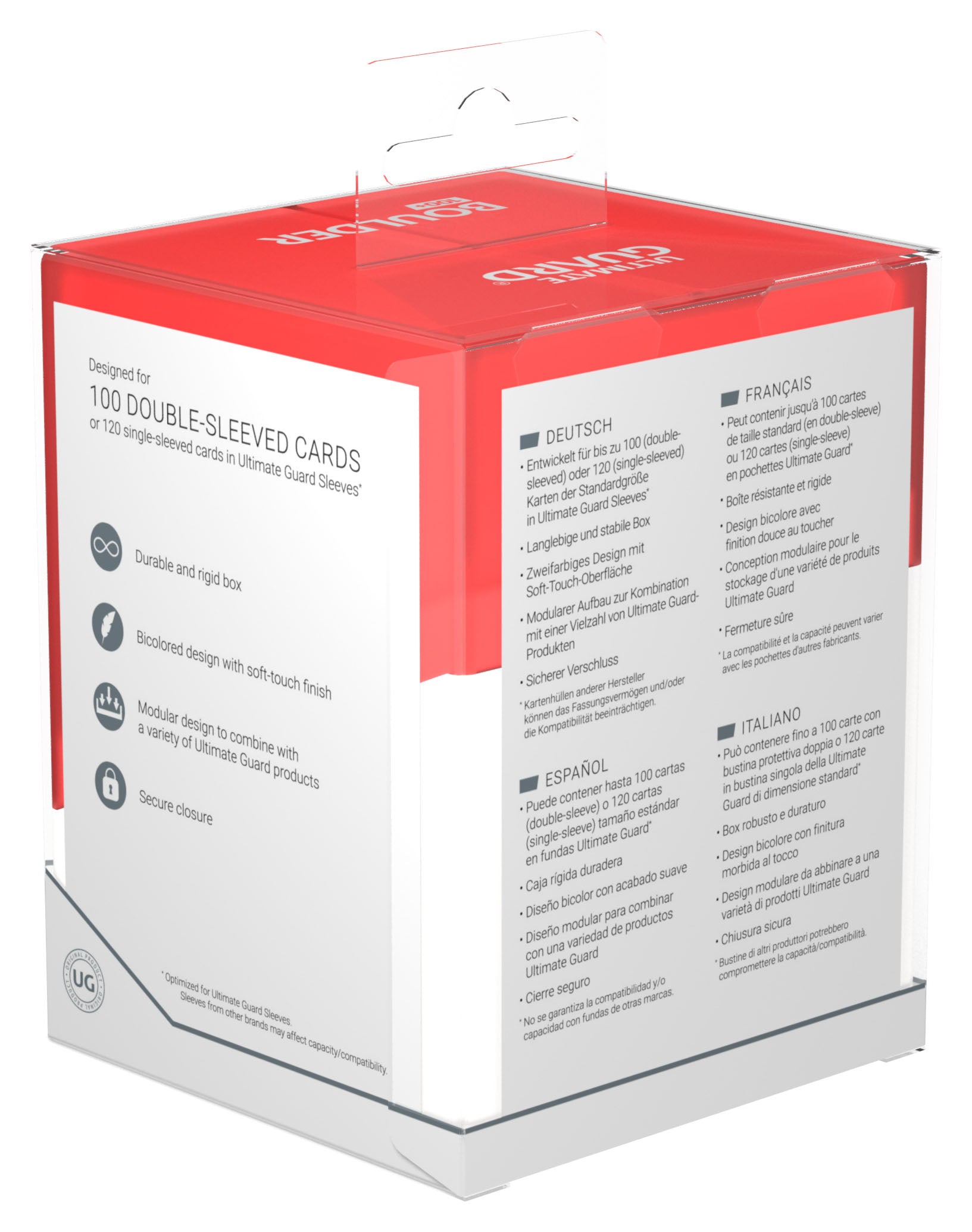 - Designed for 100 double-sleeved or 120 single-sleeved standard sized cards in Ultimate Guard Sleeves