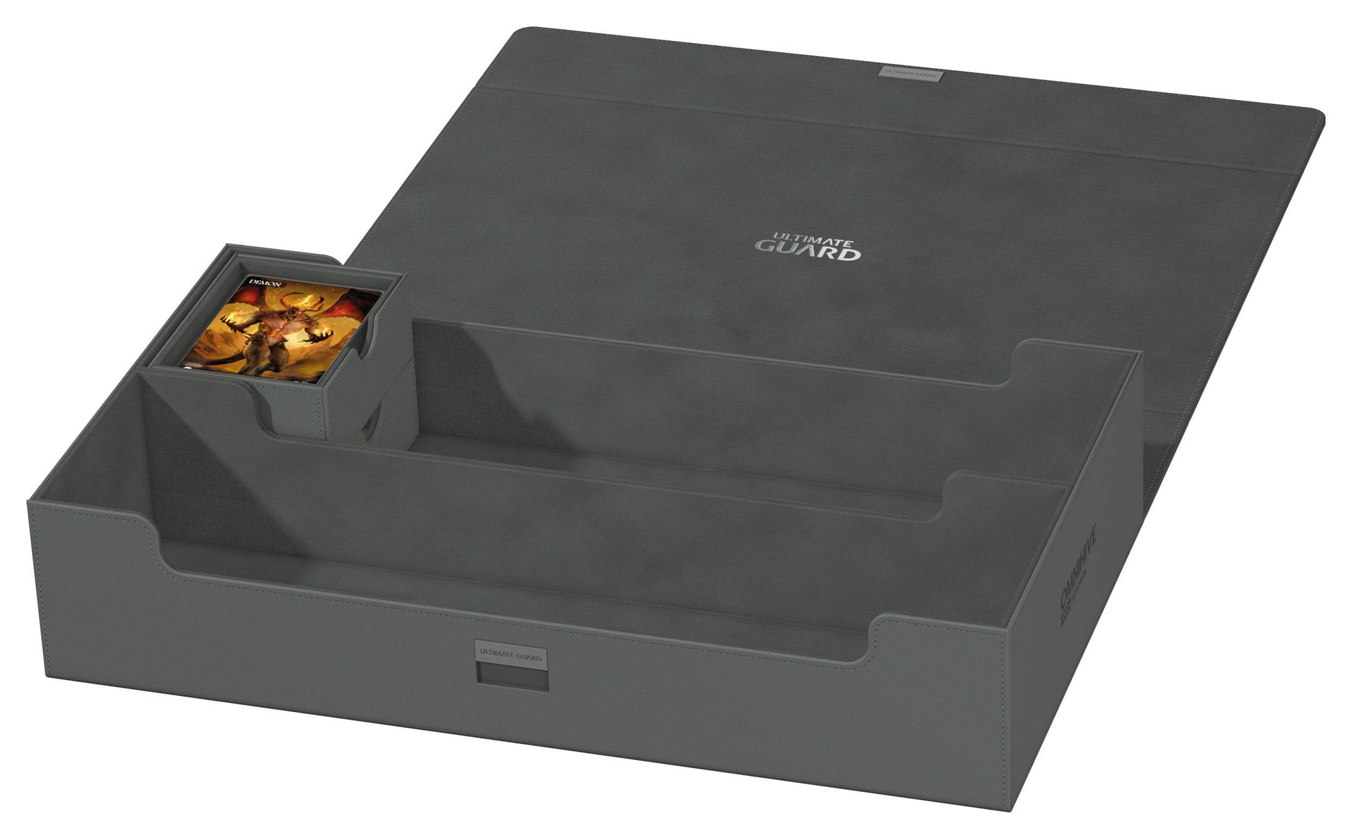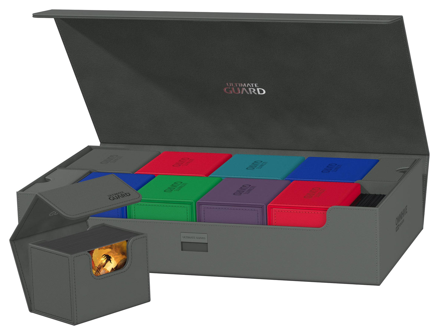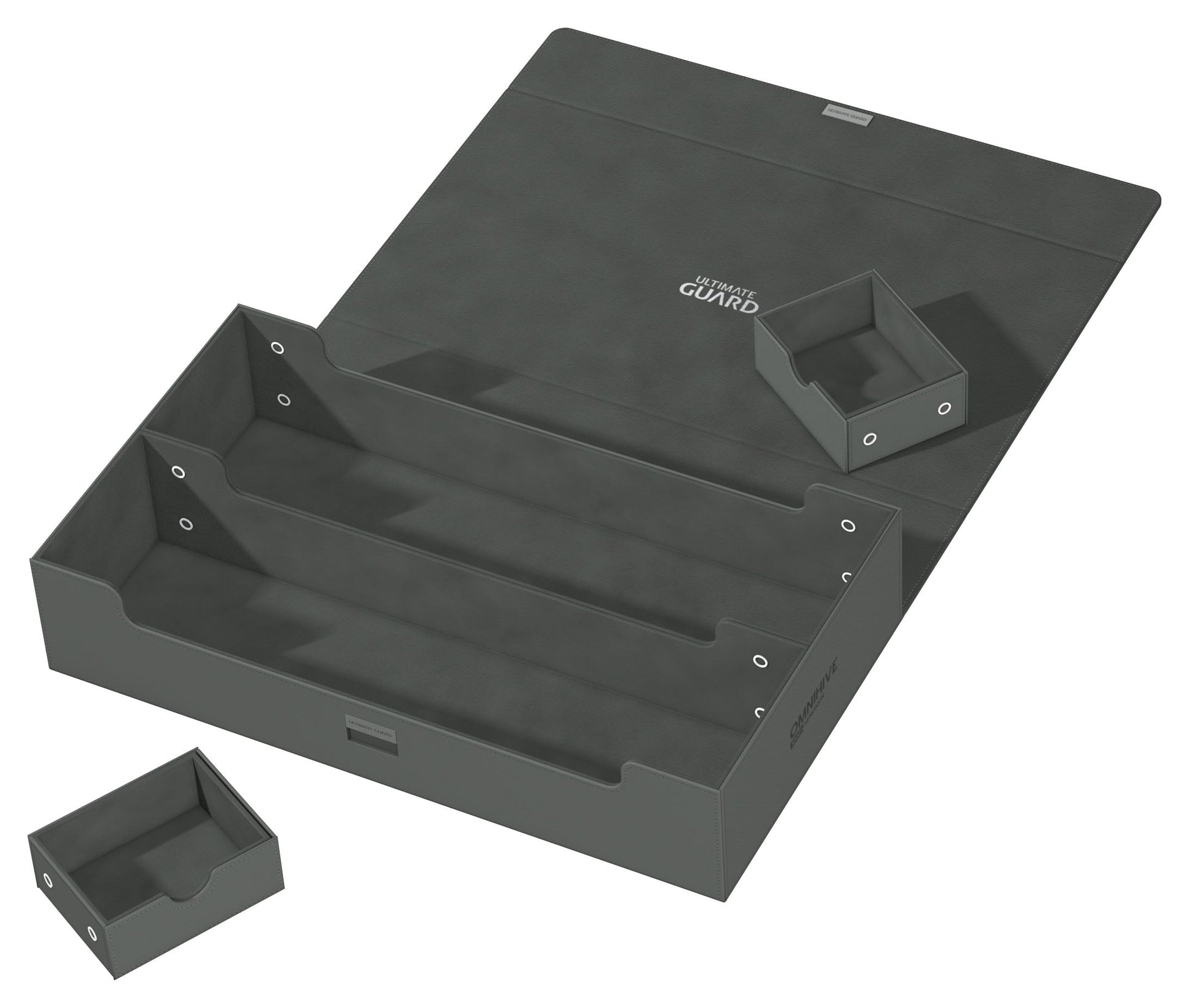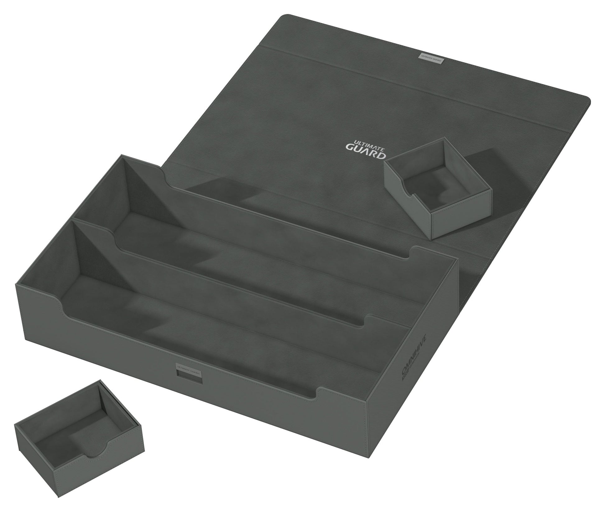 Introducing the new Omnihive 1000+! The ultimate spacious and flexible box for storing large collections. This box can hold more than 1000 double- sleeved cards or carry multiple decks and/or Play-Mats plus other Ultimate Guard products like the Sidewinder 133+. Two removable, magnetic, adjustable and stackable trays make this box unique: it's adaptable for all kinds of games and formats and enables multiple different ways of storing and using your collection.