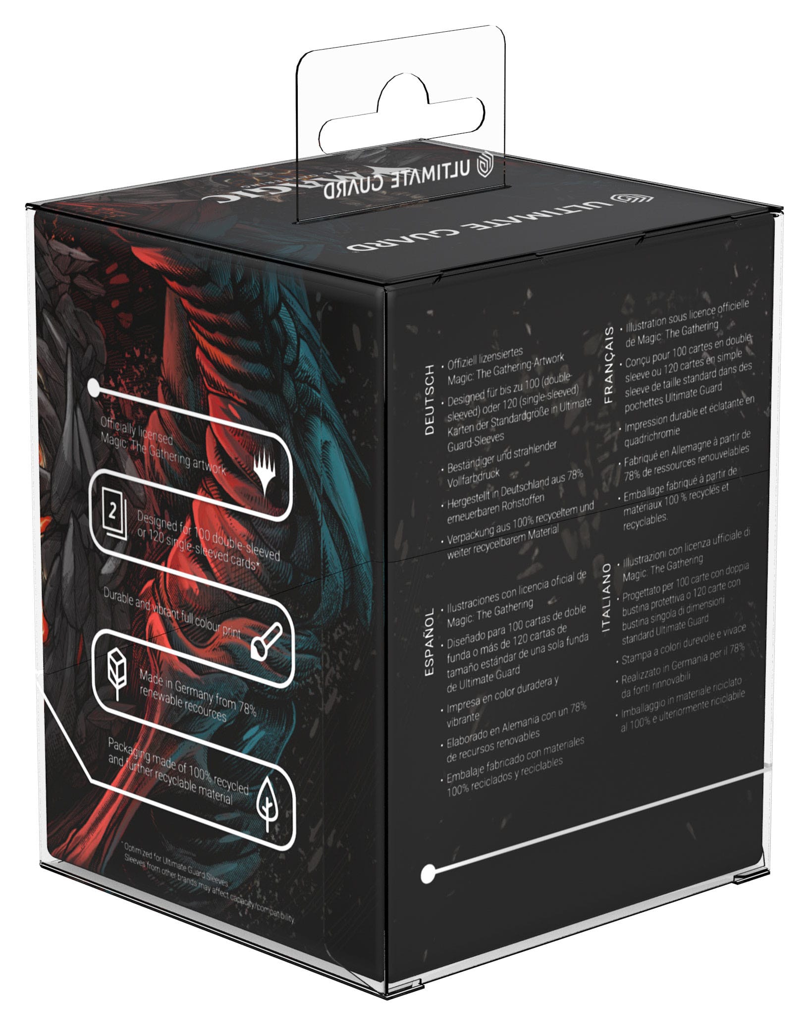 - Designed for 100 double-sleeved or 120 single-sleeved standard sized cards in Ultimate Guard Sleeves