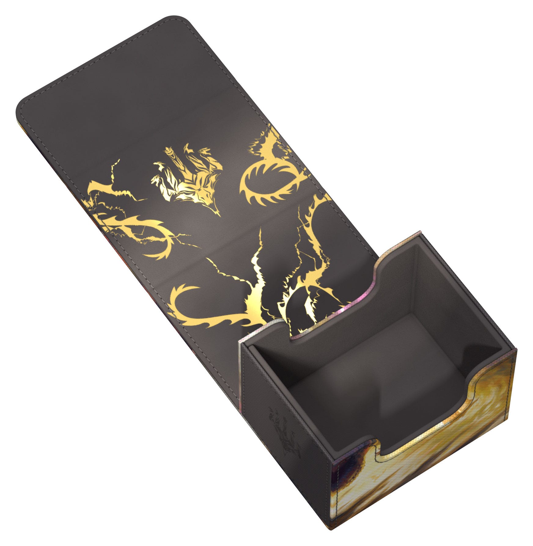 The Sidewinder 100+ made from durable Xenoskin material holds up to 100 double-sleeved or 120 single-sleeved cards, which are kept secure in the deck box thanks to a strong magnetic closure and soft microfiber interior. The sturdy, high-quality Xenoskin surface of the Sidewinder is printed in full color with officially licensed artwork from Magic: The Gathering’s Tarkir: Dragonstorm set.