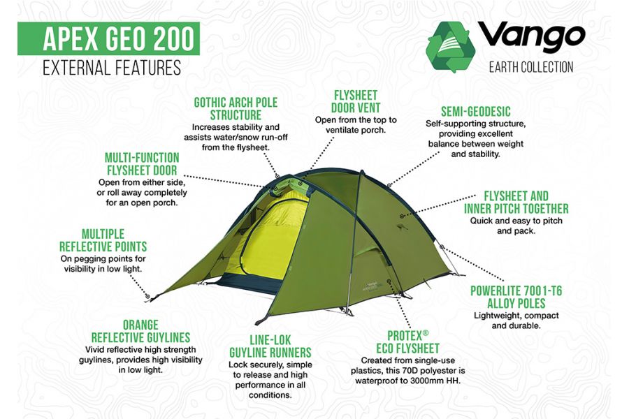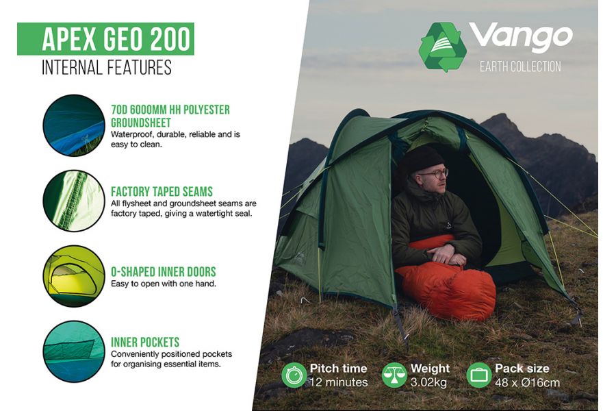 The Vango Apex Geo 200 2-man tent delivers the ideal balance of low weight and high strength for all year-round camping.