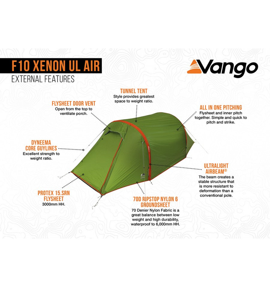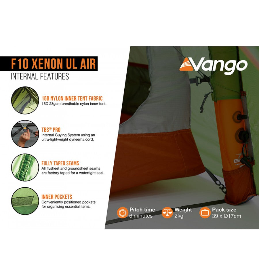 "From the Award Winning Project Hydrogen Collection, the F10 Xenon UL Air tent utilises AirBeam® technology combined with TBS® Pro to create a stable tunnel design which is quick and easy to pitch using a combination of our unique pumpsack and your bike pump.