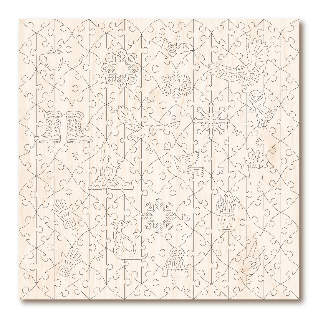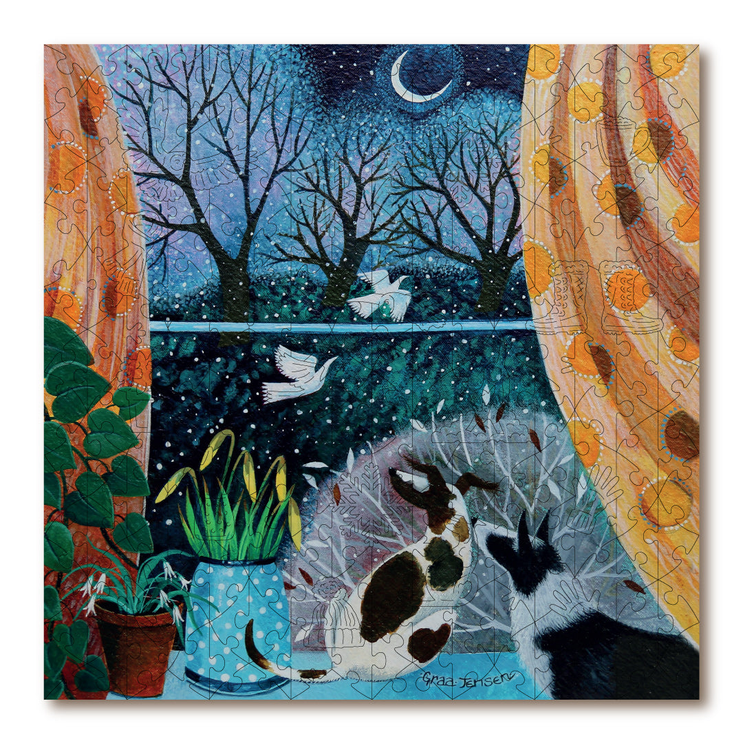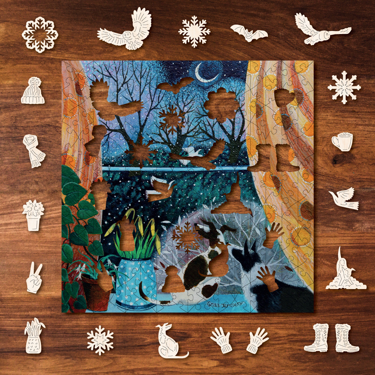 Experience the magic of winter with Watching Snowfall, a stunning wooden jigsaw puzzle. With 249 irregular and whimsical shaped pieces, this puzzle showcases a charming winter evening scene. From their cozy perch inside the cottage, two pups peek out through the window, mesmerized by the falling snow while doves fly in the moonlit sky. Perfect for puzzle enthusiasts and nature lovers alike.