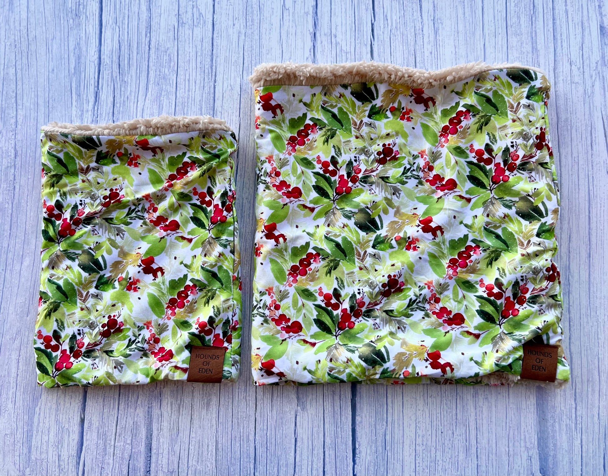 Our snoods are warm, super soft, stretchy and reversible! Made long enough to give full coverage of the neck as well as ears if desired, keeping your dogs ears warm and shielded in the cold preventing ear ache.