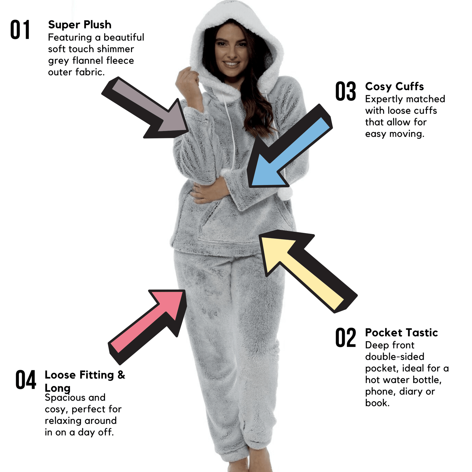 Choose the Women's Shimmer Grey Plush Fleece Hooded Pyjama Set for its exceptional comfort, stylish design, and practical features. With its super soft fleece fabric, elasticated waistband, and luxurious Sherpa edging, this pyjama set is a blend of fashion and functionality. Backed by glowing user testimonials, our pyjama set stands out for its quality and value, ensuring you get a restful night's sleep or a cozy day at home.Additional Information