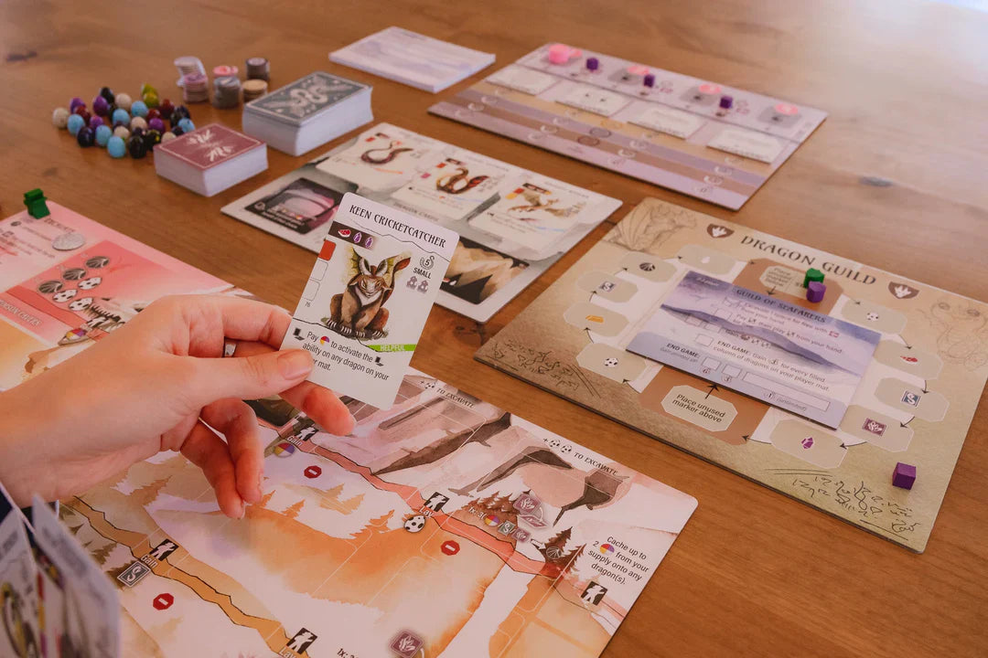 Wyrmspan plays up to 5 players, and it is flexible in size for various tables due to 3 smaller central boards (instead of a single big game board). Each player mat is 475x280mm (a little wider than Wingspan). It includes: