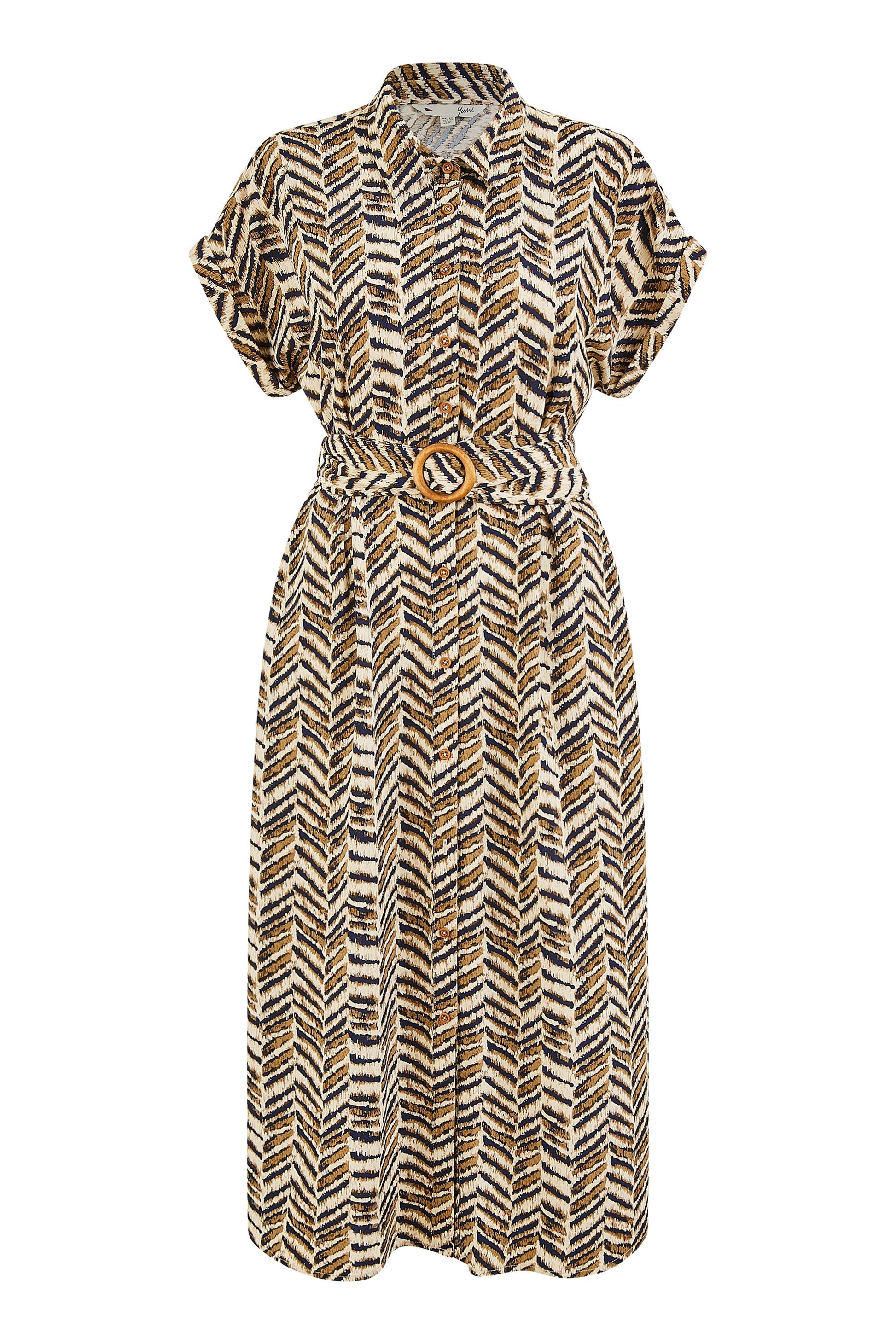 Yumi Brown Abstract Animal Print Relaxed Midi Shirt Dress With Belt