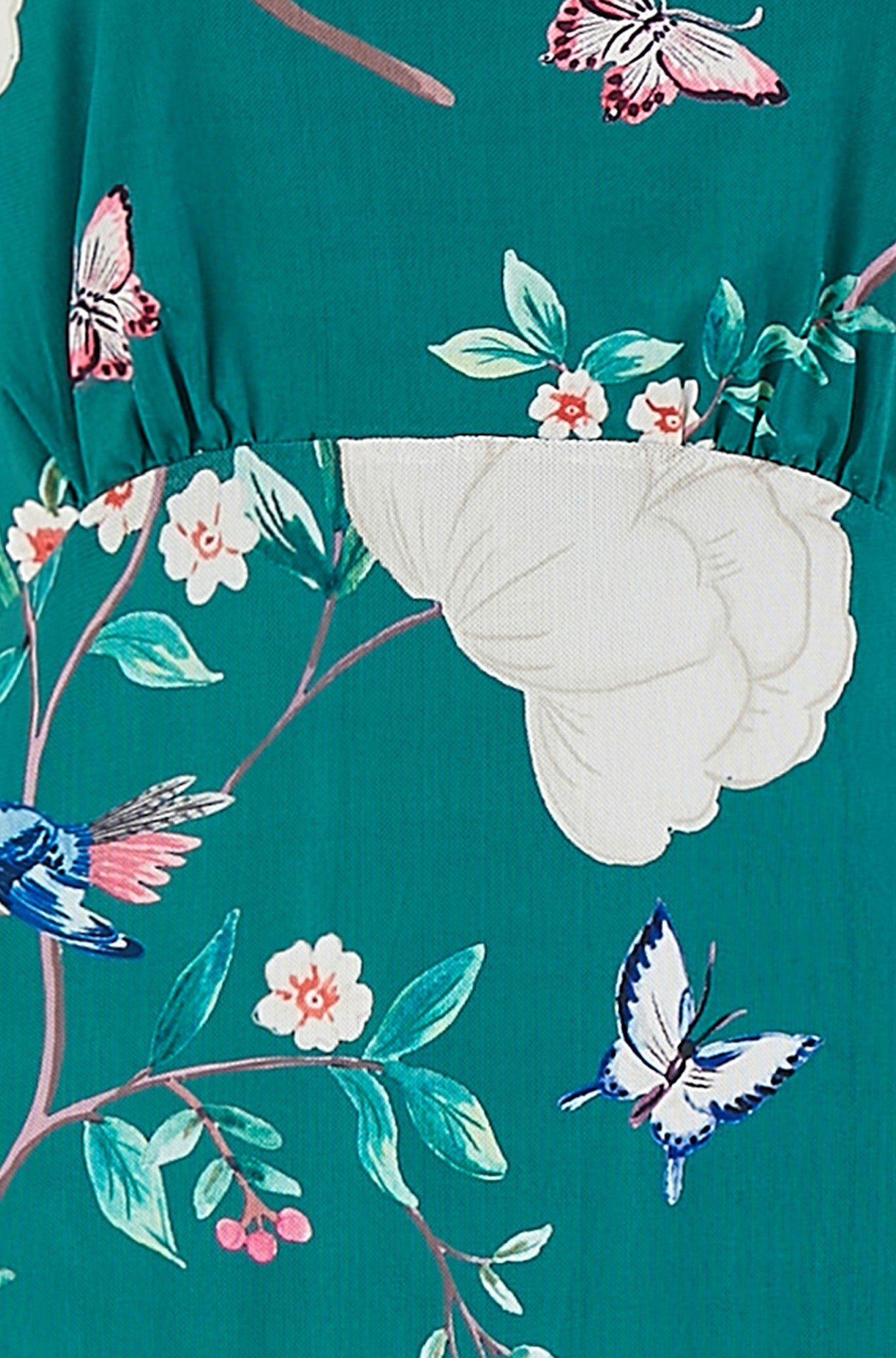 Yumi Green Mesh Bird And Floral Print Midi Dress With Ruffles