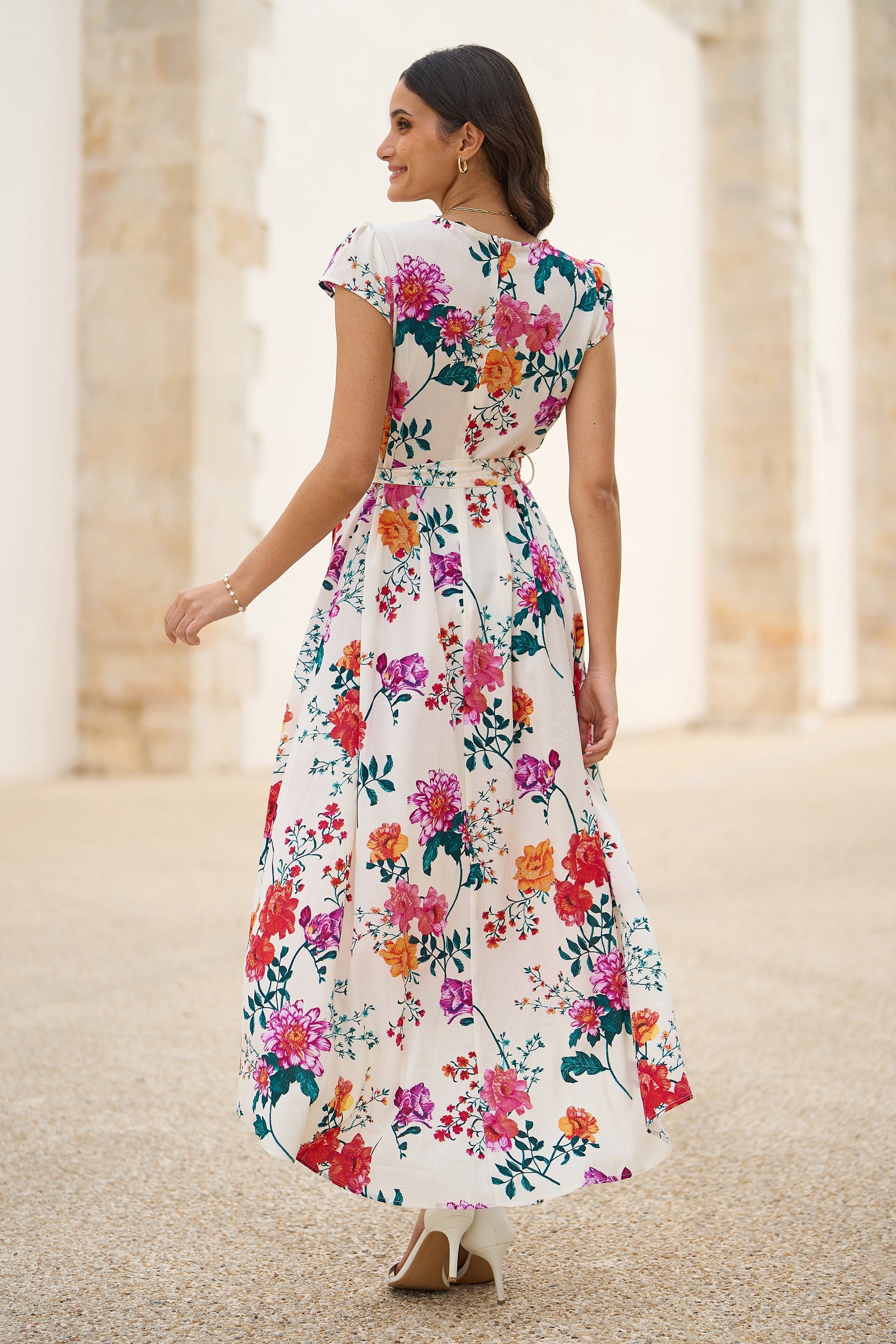 Summer time calls for big bold prints and gorgeous flattering shapes and this dress has all of these factors. With a tie at the waistline, midi length hem and cute little cap sleeves. The wrap around shape is comfortable and easy to wear with a bolero and sandals.