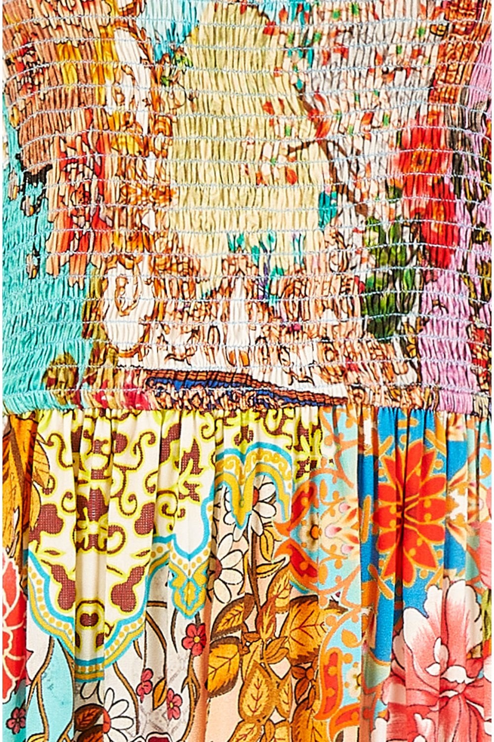 A truly show stopping all over print designed in house for Yumi, inspired by Indian fabrics, with a patchwork feel, This maxi dress will look right at home in the sunshine, with tie straps and a ruched bodice adding a comfortable feel. The maxi length had a flirty side split in the hemline, style with simple sandals and a beach bag.