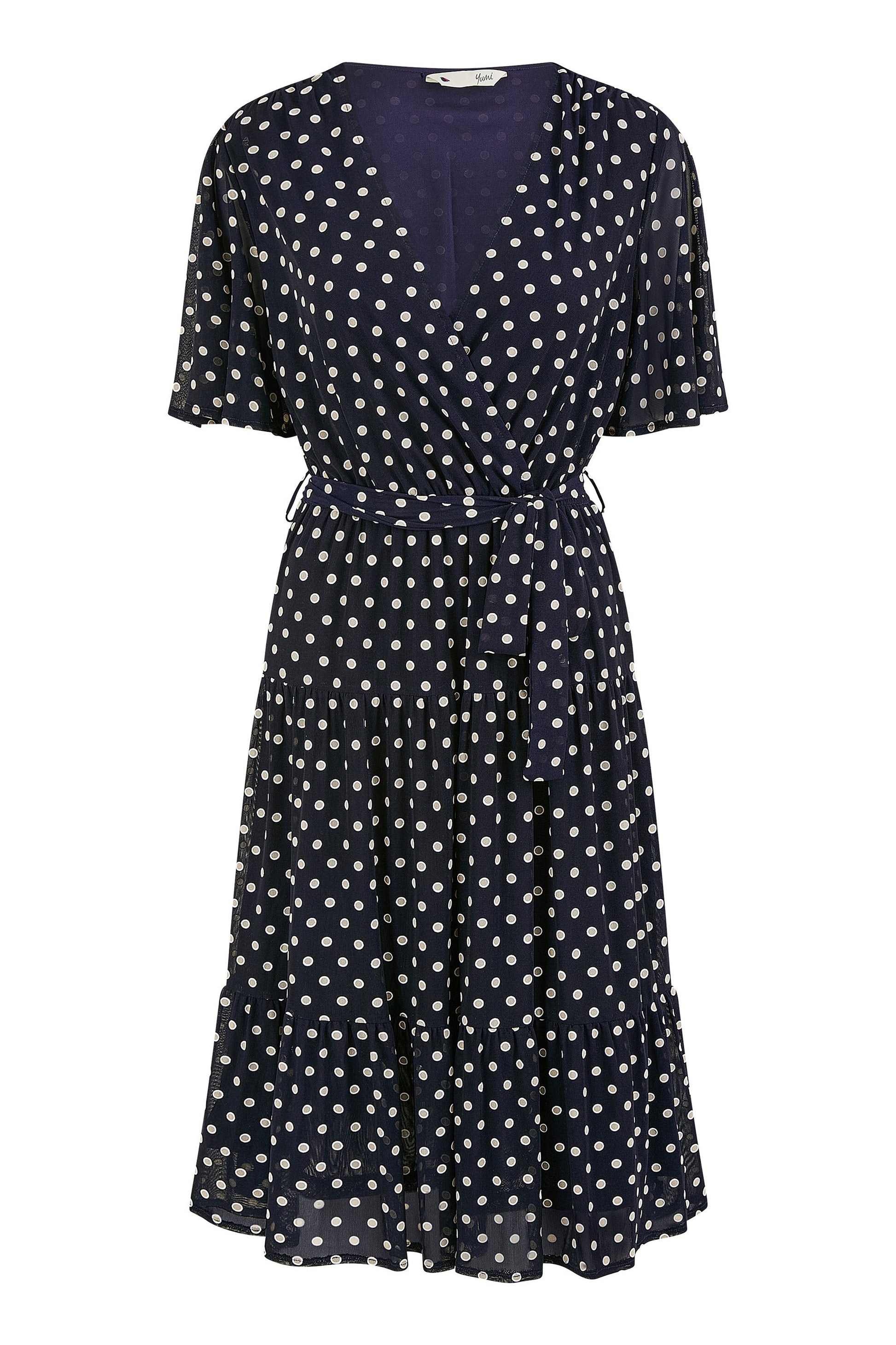 Yumi Navy Dot Print Mesh Stretch Midi Skater Dress