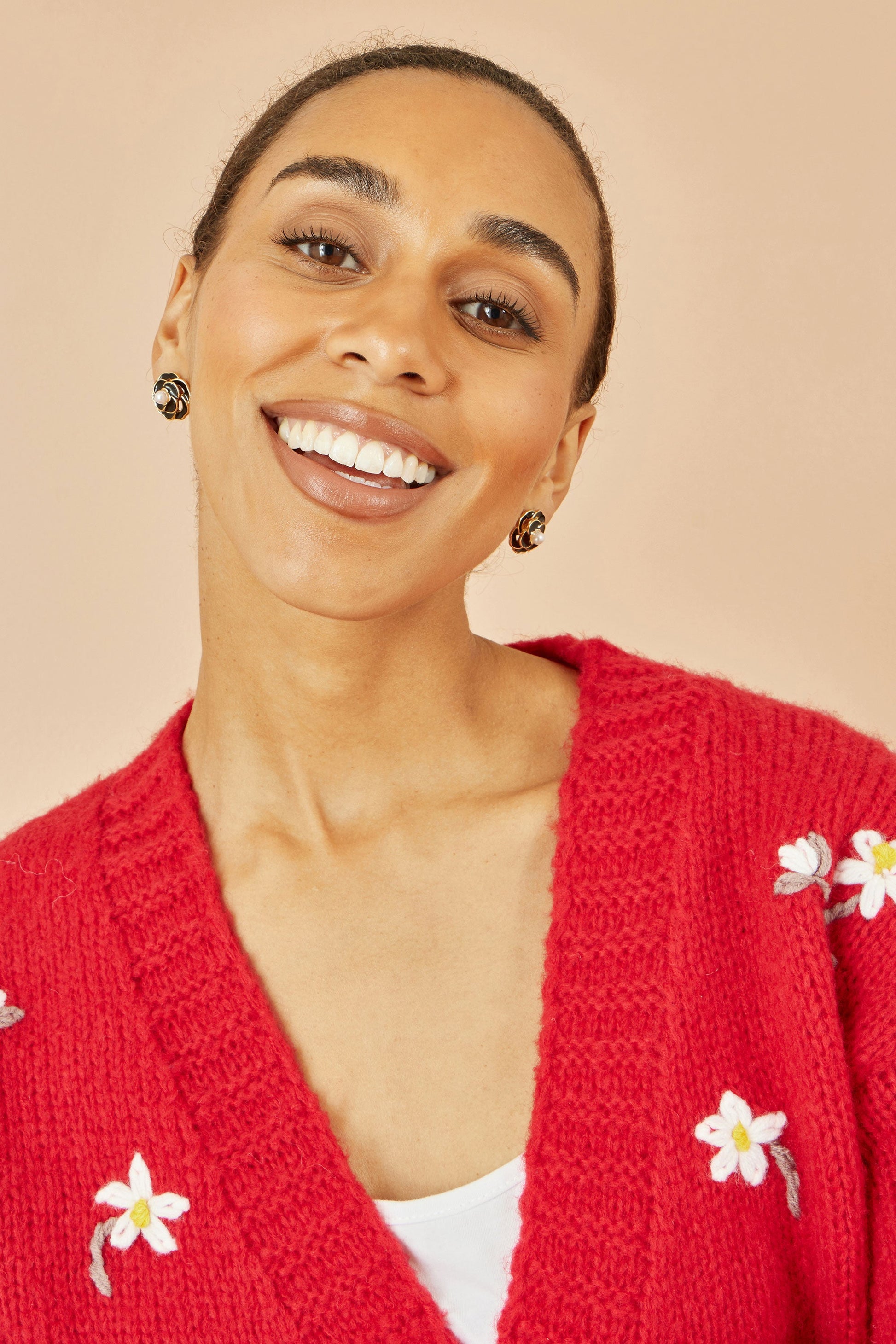 Yumi Red Hand Embroidered Chunky Knitted Cardigan